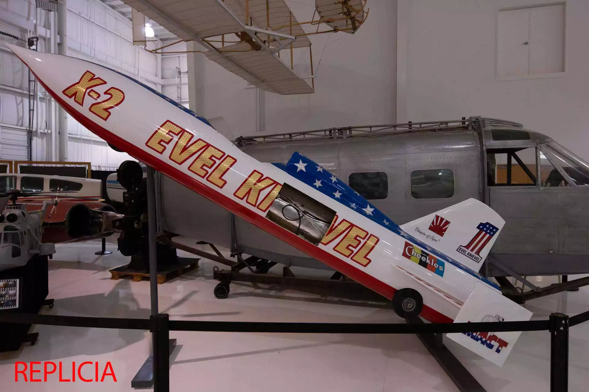 A replica of Evel Knievel’s Skycycle X-2 was built by Creative Arts for their TV series titled “Museum Men.” The TV show is based on the “behind the scenes goings on” of a company that builds museum exhibits. Creative Arts Unlimited produce historically precise displays for museums, hospitals, libraries, businesses and towns. The installation of the Skycycle X-2 replica was filmed at the Tennessee Museum of Aviation.