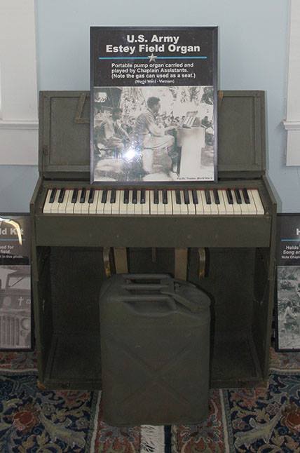 The Field Communion Kit on display with the World War II Chaplain display belonged to Army Chaplain Nathaniel C. Warburton Jr. He served with the 13th Mountain Medical Battalion in the CBI (China-Burma-India Theater of War) during the North and Central Burma Campaigns in 1944. The unit rendered medical and veterinary service to several combat units, including the famed 5307th Composite Unit (Provisional) AKA “Merrill’s Marauders”. Also on display are other items a chaplain would normally have when deployed, including an Estey portable pump organ, an officer’s field desk with typewriter, a hymnal chest that holds 150 WWII Song and Service hymnals, a combat helmet, a U.S. Army chaplain stole and various testaments for different denominations.