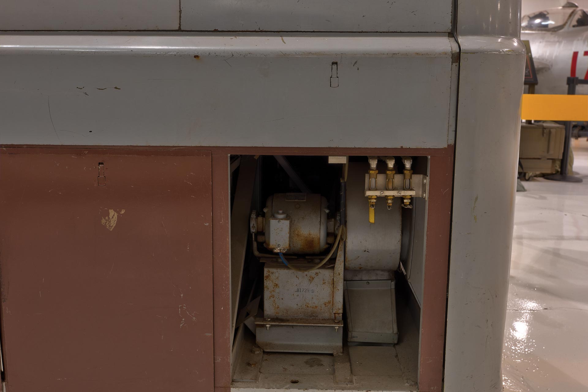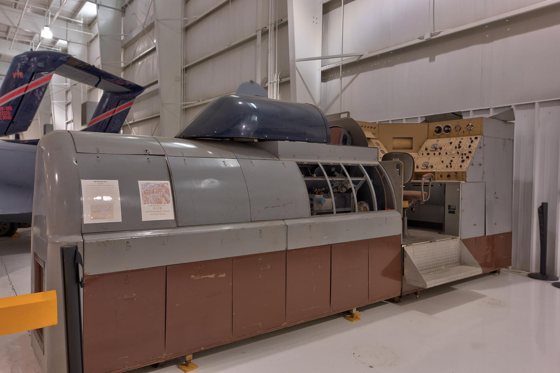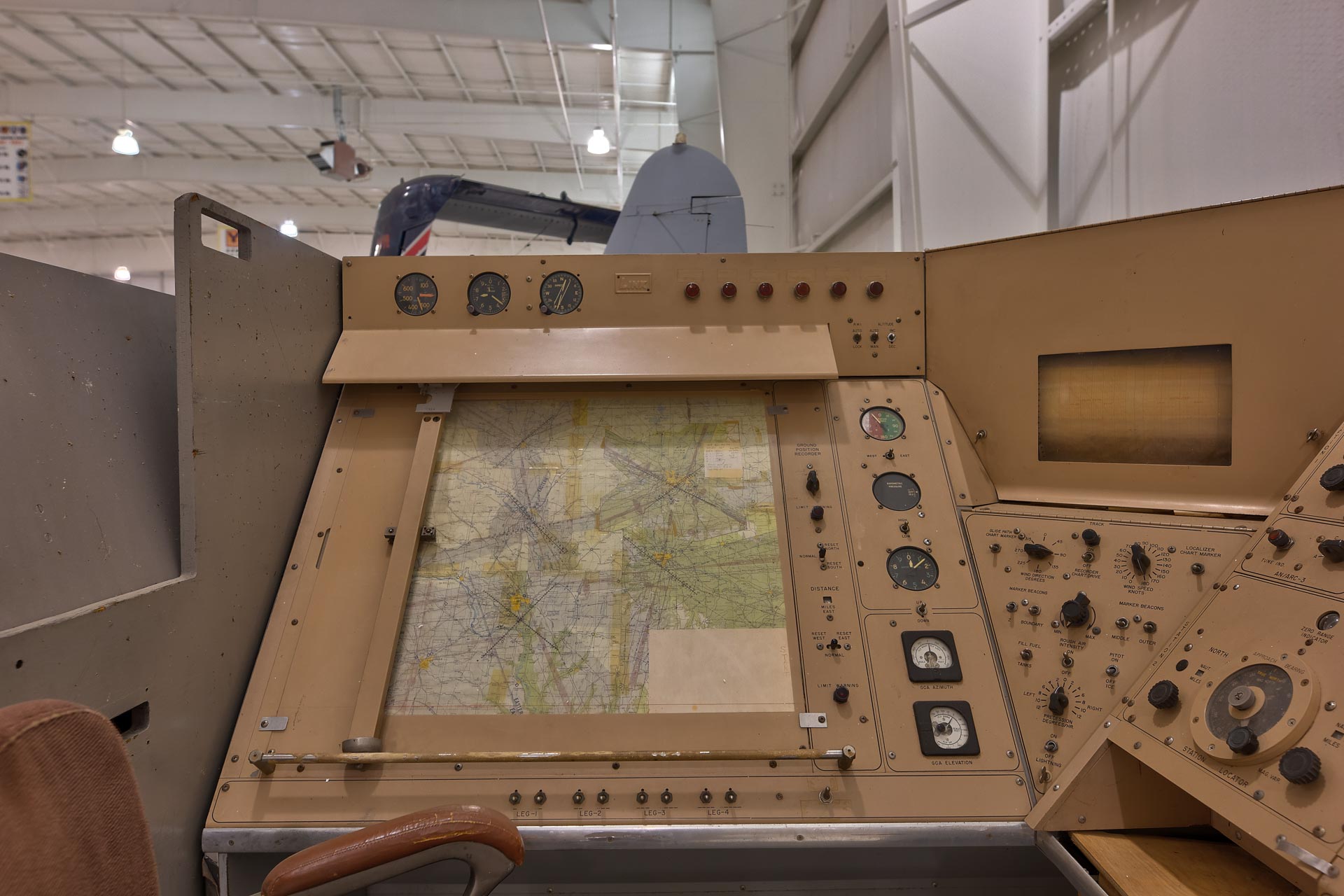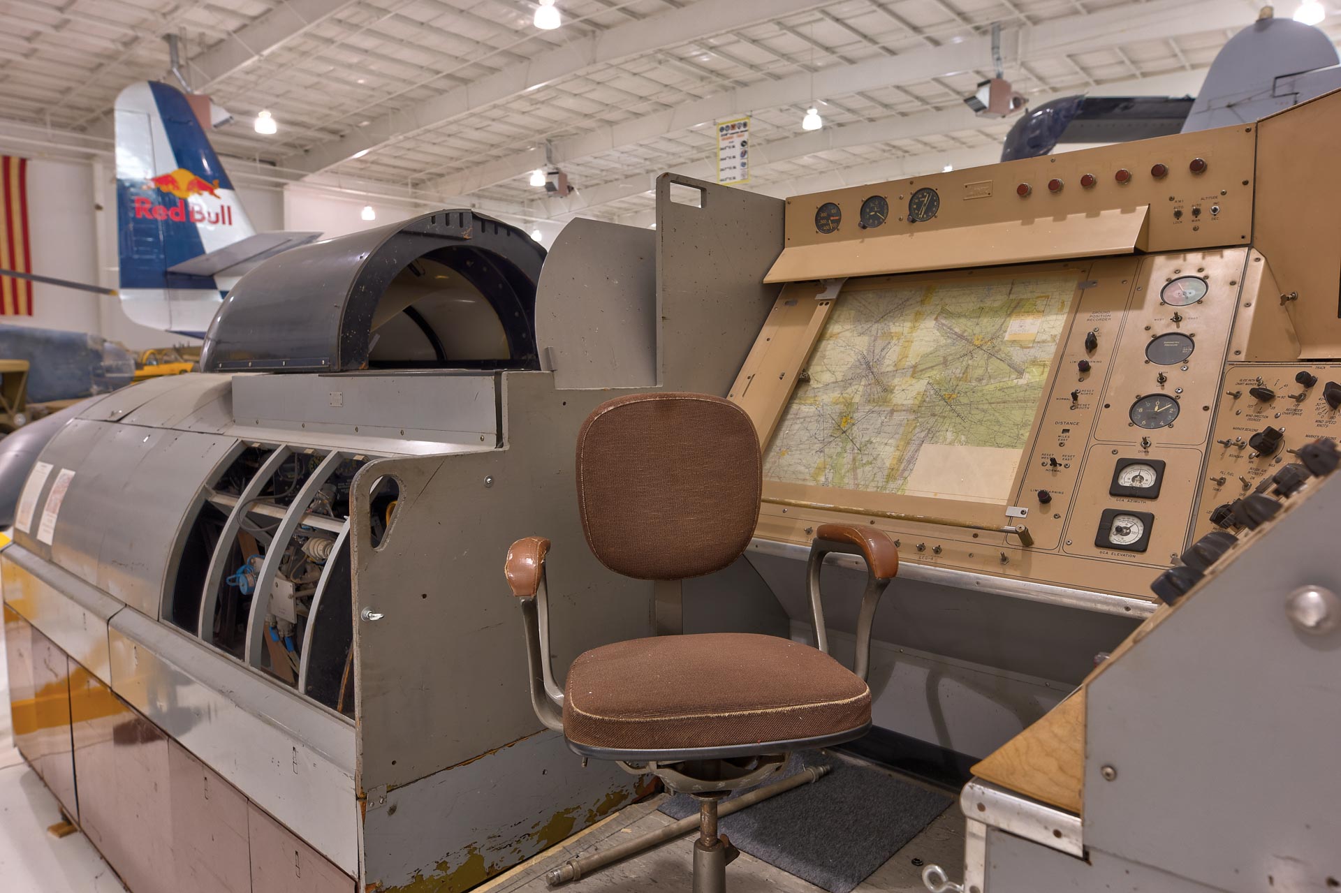 This 1950’s era trainer was equipped with an electronic analogue AC computer, developed in 1948. From the Handbook: โThe cockpit of the C-11B Trainer is essentially a mock-up of the F-80A aircraft. The instrument panel includes, besides the usual engine and flight indicators, navigational instruments, such as Type ID-249 Course Indicator, Type ID-250 Radio Magnetic Indicator, Distance Measuring Indicator, B-1 Attitude Gyro Indicator and Zero Reader. The right shelf includes AN/ARN-21 radio controls, Zero Reader selector switch, and radio selector switch and jack panel. The left shelf includes various flight, engine and accessory controls. The control stick and rudder pedals are pneumatically restricted in their movements to simulate realistically control loading of a jet aircraft. They are connected to pneumatic cylinders, the pressure of which is governed by the dynamic pressure factor (a relation of air speed, air density, etc.).โ