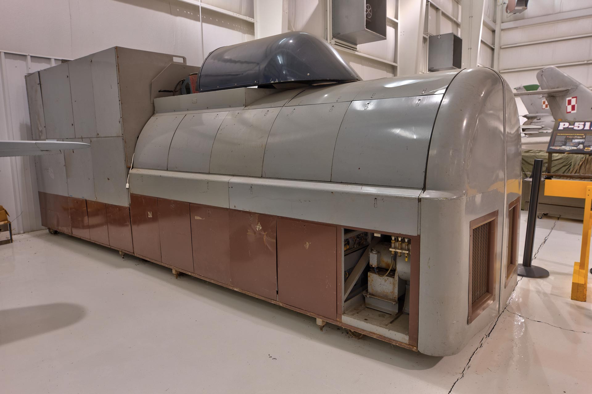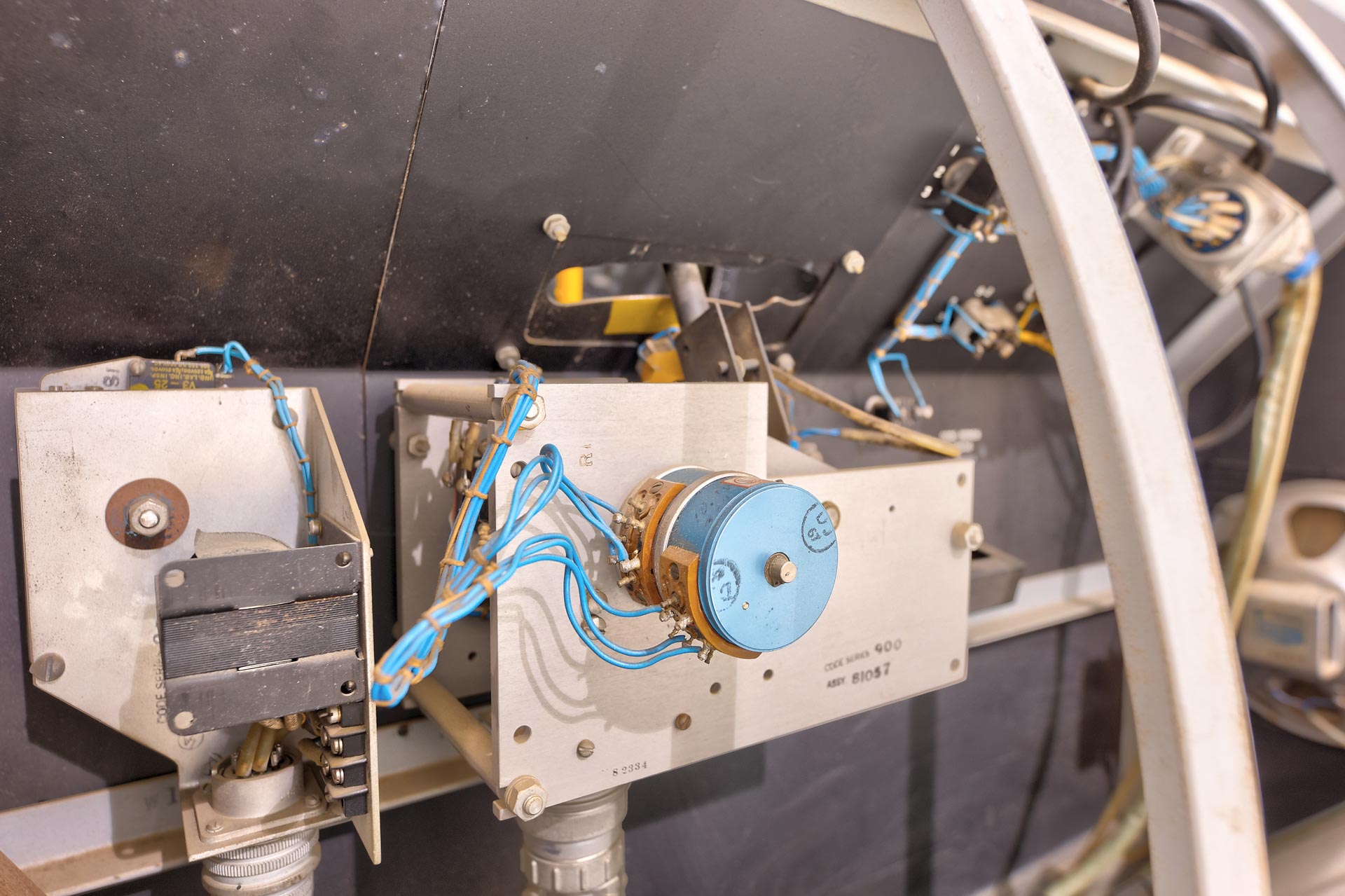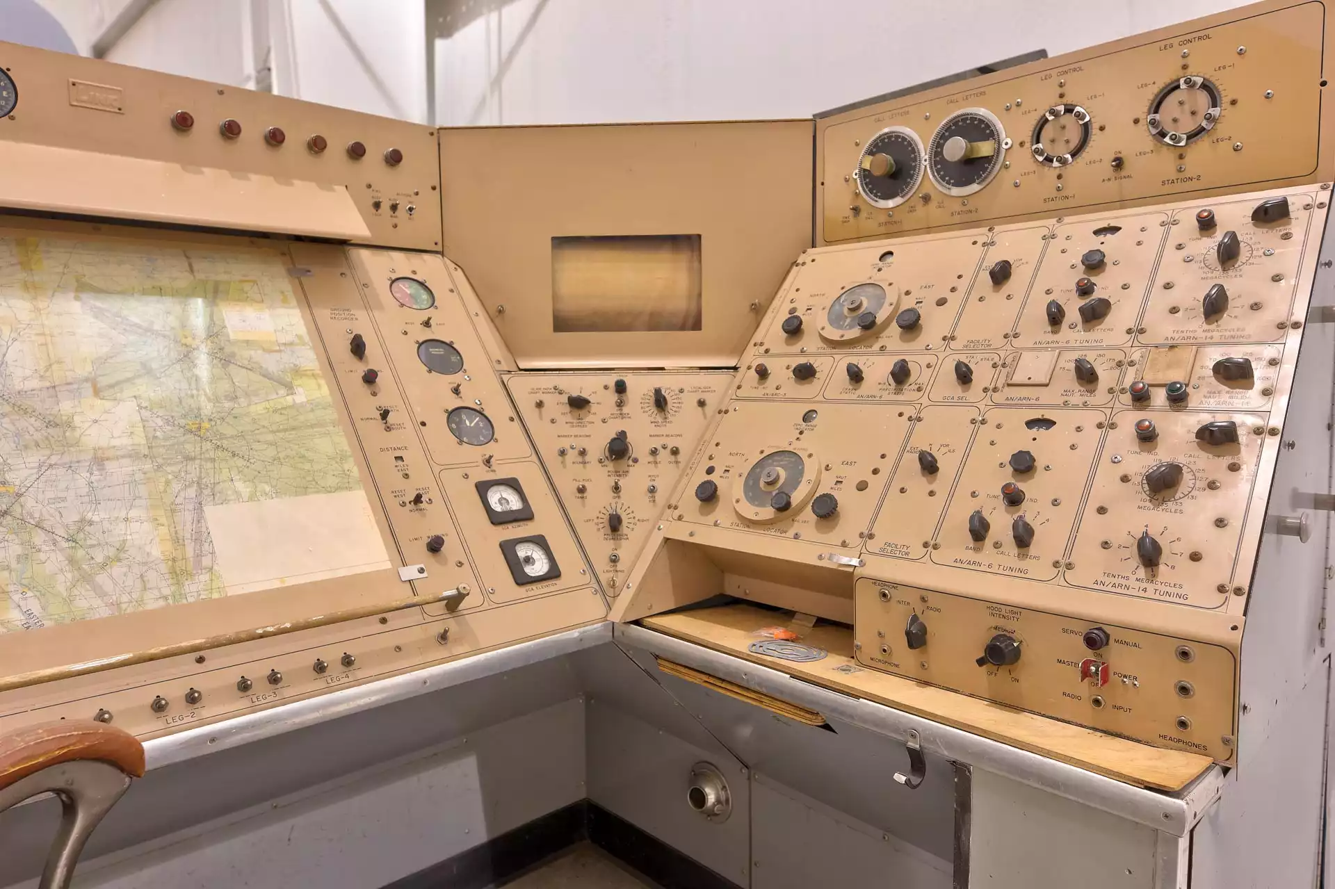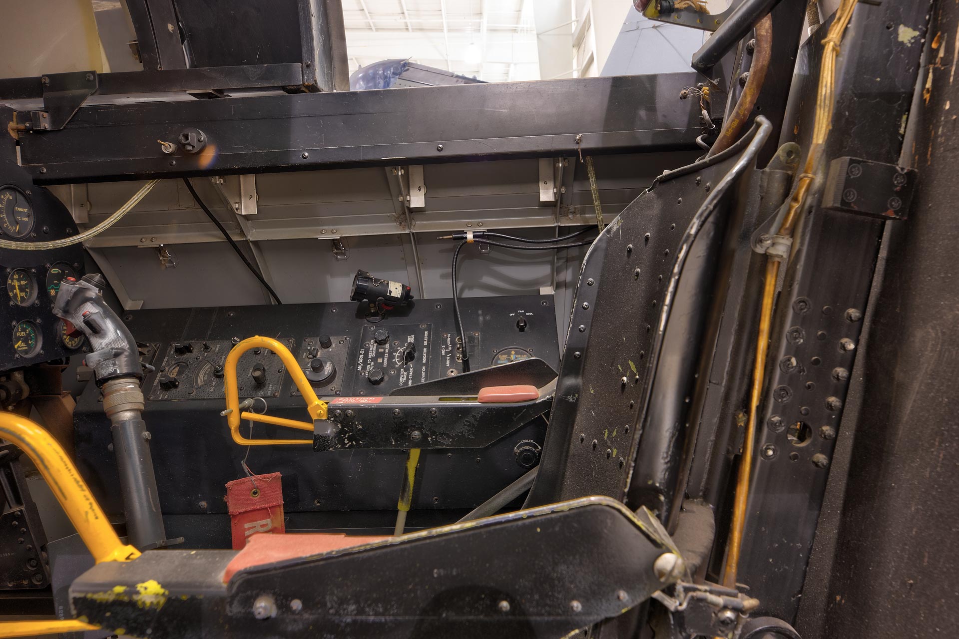 This 1950’s era trainer was equipped with an electronic analogue AC computer, developed in 1948. From the Handbook: โThe cockpit of the C-11B Trainer is essentially a mock-up of the F-80A aircraft. The instrument panel includes, besides the usual engine and flight indicators, navigational instruments, such as Type ID-249 Course Indicator, Type ID-250 Radio Magnetic Indicator, Distance Measuring Indicator, B-1 Attitude Gyro Indicator and Zero Reader. The right shelf includes AN/ARN-21 radio controls, Zero Reader selector switch, and radio selector switch and jack panel. The left shelf includes various flight, engine and accessory controls. The control stick and rudder pedals are pneumatically restricted in their movements to simulate realistically control loading of a jet aircraft. They are connected to pneumatic cylinders, the pressure of which is governed by the dynamic pressure factor (a relation of air speed, air density, etc.).โ