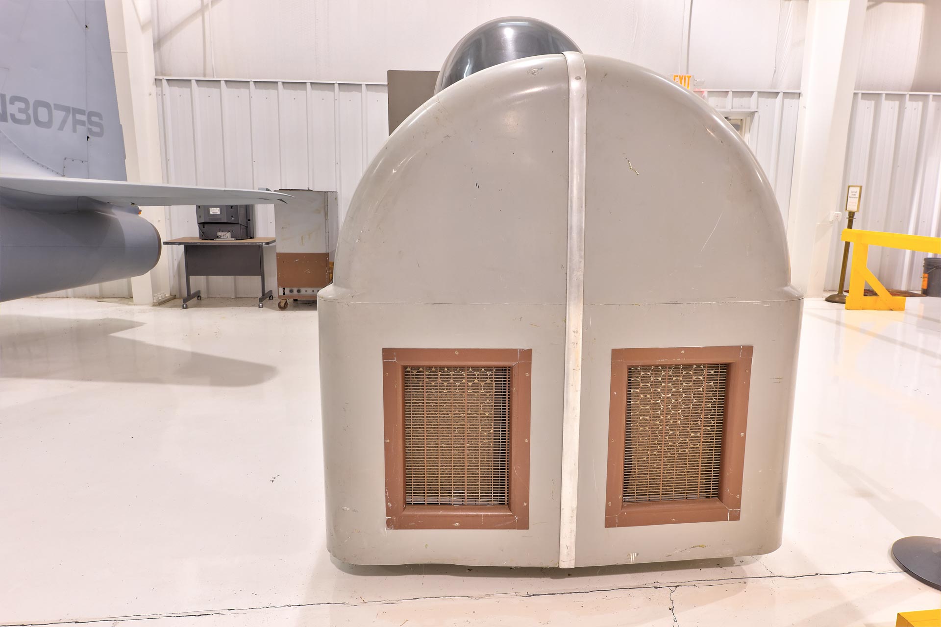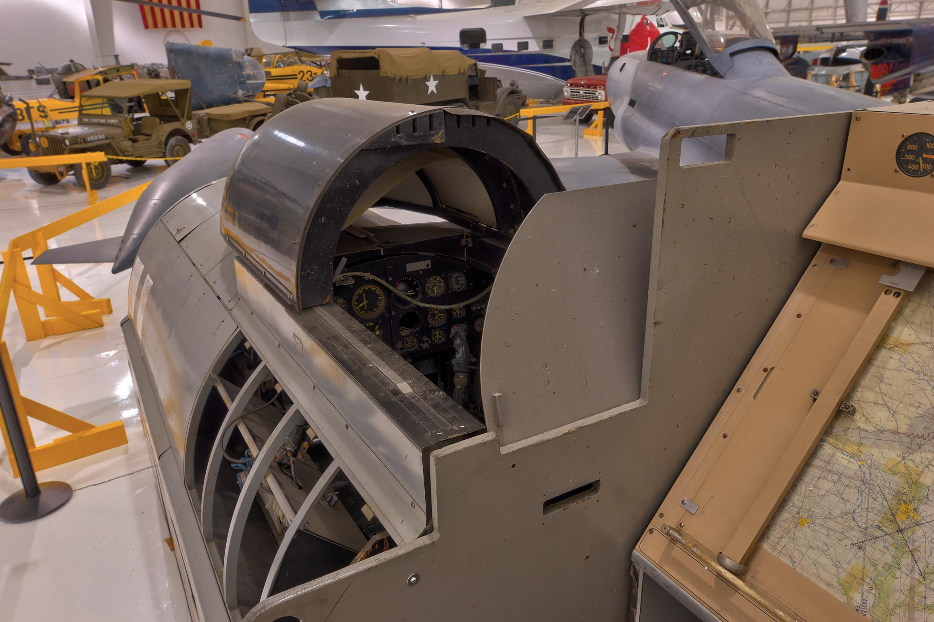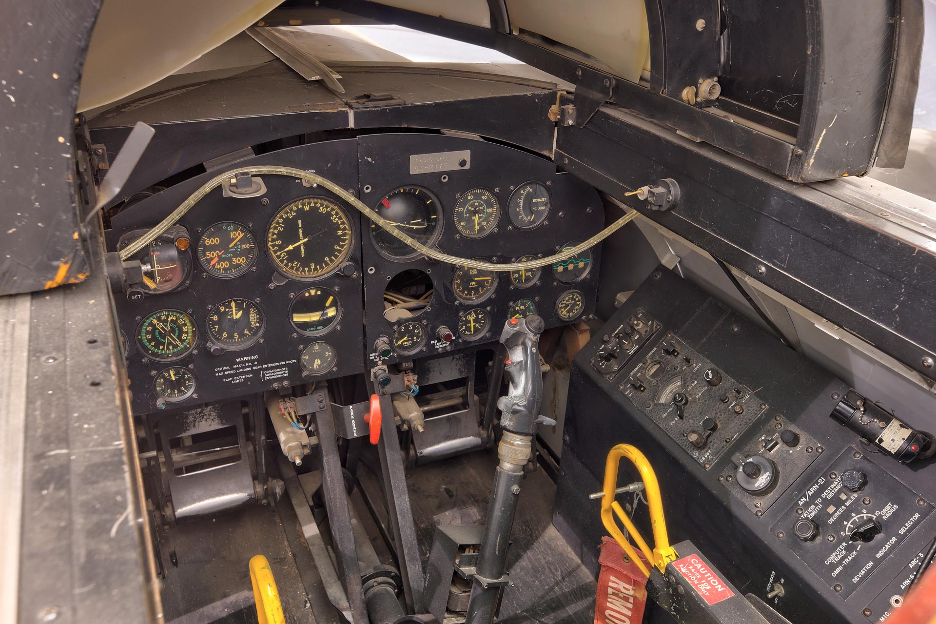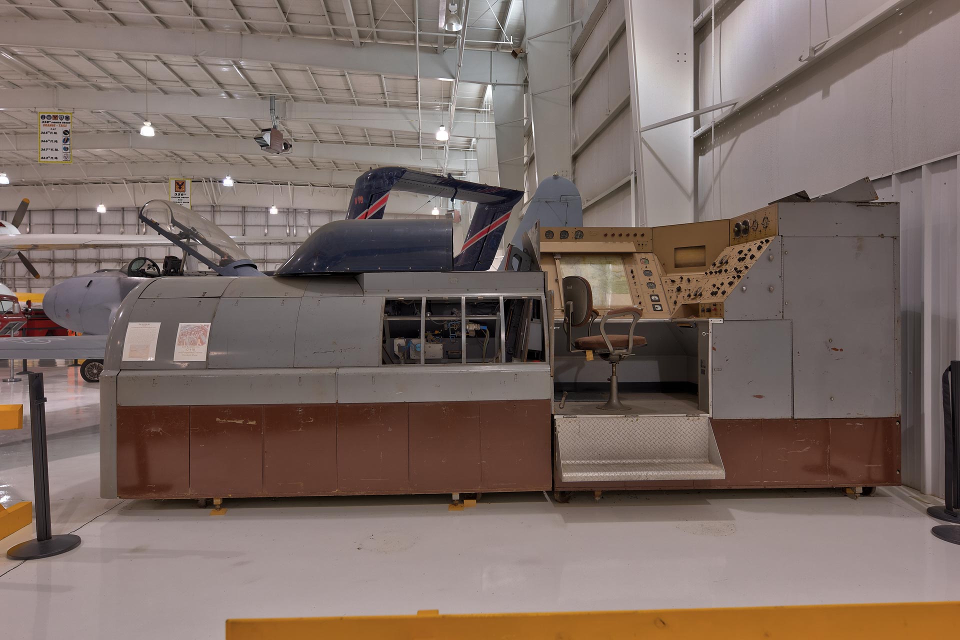 This 1950’s era trainer was equipped with an electronic analogue AC computer, developed in 1948. From the Handbook: โThe cockpit of the C-11B Trainer is essentially a mock-up of the F-80A aircraft. The instrument panel includes, besides the usual engine and flight indicators, navigational instruments, such as Type ID-249 Course Indicator, Type ID-250 Radio Magnetic Indicator, Distance Measuring Indicator, B-1 Attitude Gyro Indicator and Zero Reader. The right shelf includes AN/ARN-21 radio controls, Zero Reader selector switch, and radio selector switch and jack panel. The left shelf includes various flight, engine and accessory controls. The control stick and rudder pedals are pneumatically restricted in their movements to simulate realistically control loading of a jet aircraft. They are connected to pneumatic cylinders, the pressure of which is governed by the dynamic pressure factor (a relation of air speed, air density, etc.).โ