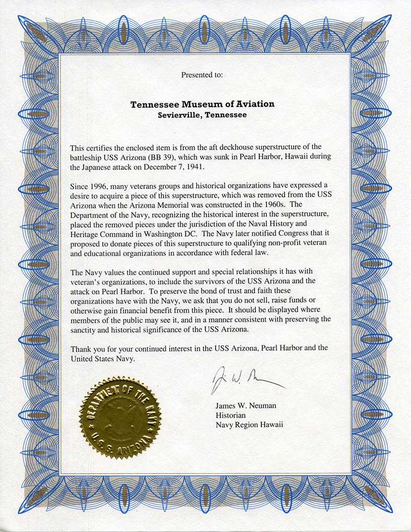 This piece of steel was salvaged from the aft deckhouse superstructure of the battleship U.S.S. Arizona (BB 39), which was sunk during the Japanese attack on Pearl Harbor, Hawaii on December 7th, 1941.
